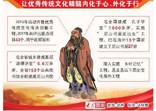 “曲阜優(yōu)秀傳統(tǒng)文化傳承發(fā)展示范區(qū)”,于2016年3月列入國家“十三五”規(guī)劃綱要。我省提出,力爭(zhēng)經(jīng)過15年左右的努力,打造具有國際影響力的道德文化首善之區(qū)和世界東方精神家園,在世界儒學(xué)研究和文明交流互鑒中的核心地位更加鞏固。