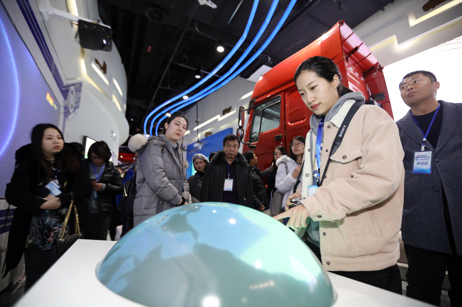 采訪團(tuán)記者對(duì)中國(guó)重汽展廳內(nèi)的觸摸球“愛(ài)不釋手”。