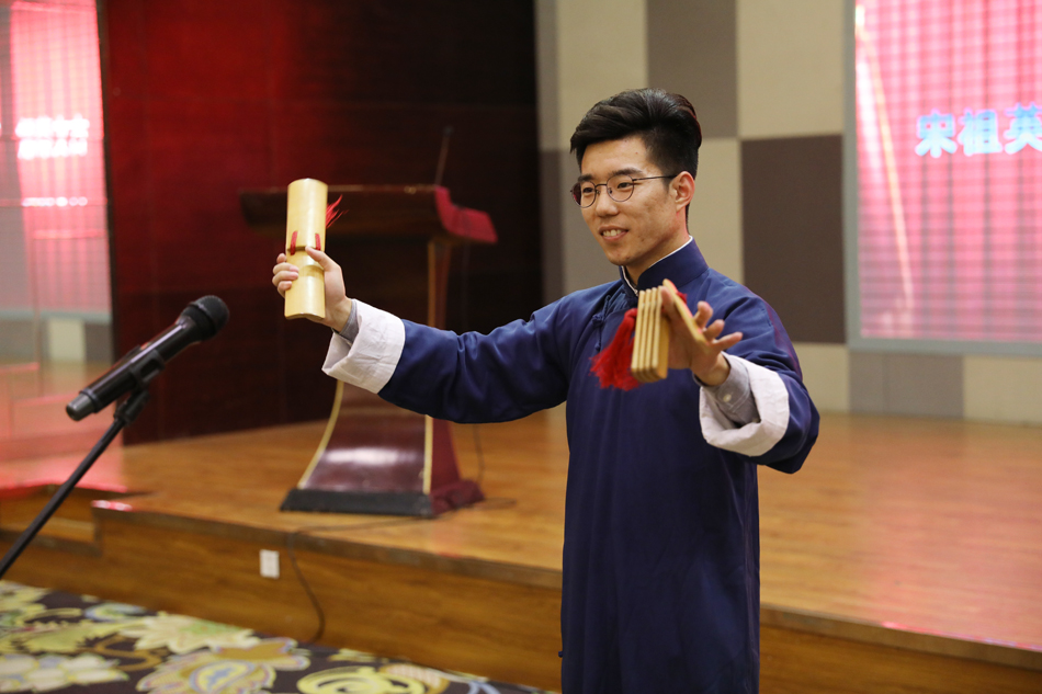 大眾網(wǎng)記者在晚餐時(shí)為大家表演山東快書助興。