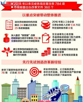 改革大潮,競相涌動。黨的十八屆三中全會開啟了全面深化改革的新征程。我市根據(jù)中央部署、省委省政府要求、全市發(fā)展需要和基層實際,科學(xué)制定總體方案、年度計劃,各項改革堅持于法有據(jù),依法有序。四年來,市委全面深化改革領(lǐng)導(dǎo)小組共召開27次會議,審議通過77個重要改革方案,著力推動了中央和省出臺的改革文件、承擔(dān)的國家和省改革試點以及年度工作要點任務(wù)和重點改革事項的落實。2014年以來,我市完成各類改革任務(wù)784項,市級層面出臺改革文件360個,一批制約經(jīng)濟社會發(fā)展的突出矛盾和問題得到解決,創(chuàng)造了一系列改革創(chuàng)新的經(jīng)驗?zāi)J?全市經(jīng)濟社會保持了持續(xù)健康發(fā)展。
