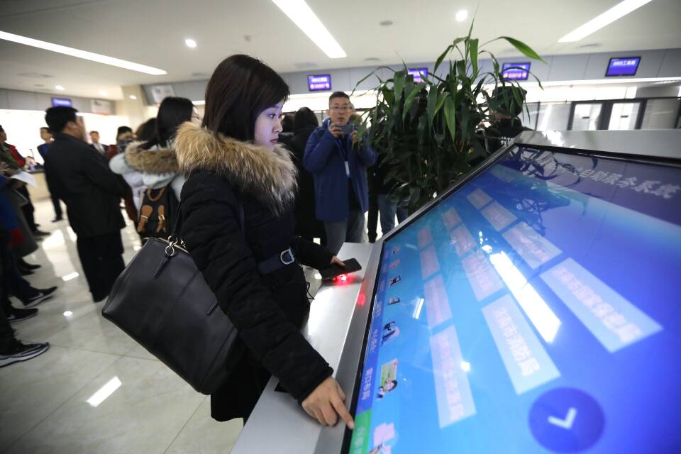 采訪團記者體驗濟南市政務服務中心自助服務系統。