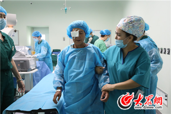 術(shù)后,58歲艾姆拉罕·麥麥提在醫(yī)護人員的陪伴下走出手術(shù)室