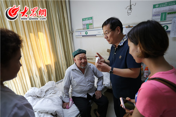 7月21日一早,山東大學第二醫院眼科主任張晗來到艾買爾·托合提病床前,為其揭開紗布。此刻的艾買爾·托合提在睜開眼睛的一瞬間,可以重見光明。揭開紗布后的艾買爾·托合提激動地說道:“亞克西,太棒了!終于看清楚為我手術的山東專家了,太感謝你們了”。攝影/王厚江