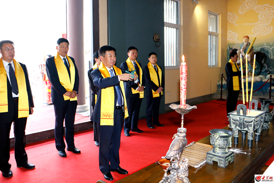 “擊鼓九通,鳴金九響,歌舞告祭”,在演繹舜帝九五至尊的聲樂中,主祭景芝酒業(yè)公司董事長劉全平,率公司常務副總經(jīng)理來安貴,副總經(jīng)理趙德義登上酒祖大殿,經(jīng)洗塵禮、沃盥禮、熏香禮后,向大舜酒祖、儀狄、杜康奉香獻馨,恭行敬禮。
