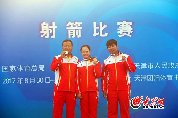 青島小伙王大鵬連奪男子射箭個人、射箭混合團體、射箭男子團體三塊金牌。