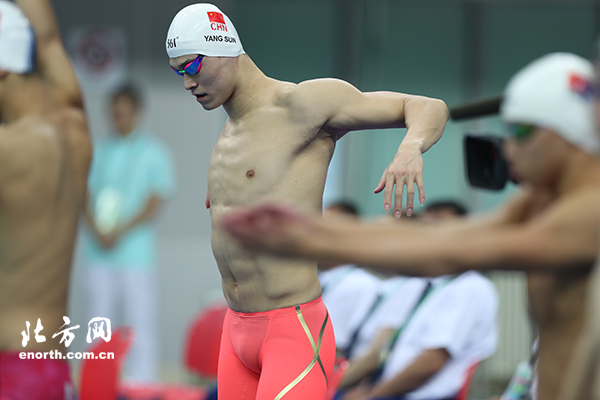 8月31日,第十三屆全運會游泳大項正式在天津奧林匹克中心鳴鑼開賽。首日比賽共產生4枚金牌。分別為男子400米個人混合泳、男子400米自由泳、女子4×100米自由泳接力以及女子400米個人混合泳。男子400米自由泳決賽中,孫楊發揮完美,以3分41秒94奪冠。