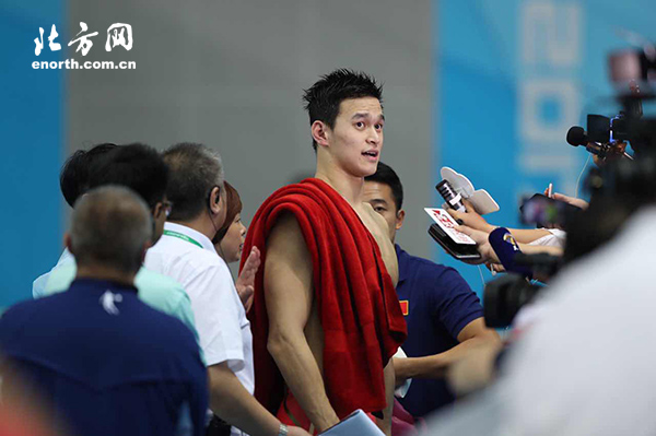 天津北方網訊 8月31日,第十三屆全運會游泳大項正式在天津奧林匹克中心鳴鑼開賽。首日比賽共產生4枚金牌。分別為男子400米個人混合泳、男子400米自由泳、女子4×100米自由泳接力以及女子400米個人混合泳。男子400米自由泳決賽中,孫楊發揮完美,以3分41秒94奪冠。