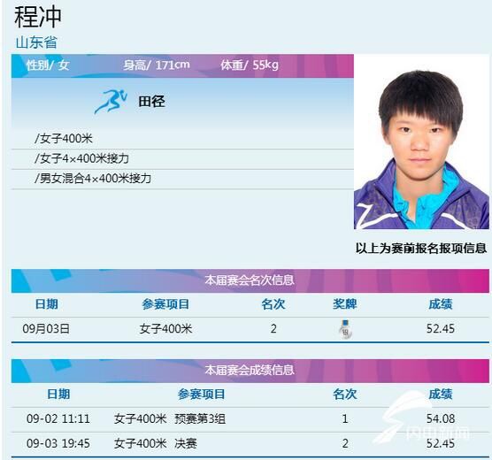 大眾網(wǎng)9月4日訊 9月3日晚,在天津舉行的第十三屆全運會田徑女子400米決賽中,德州選手程沖跑出了52秒45,成功刷新自己的最好成績,并為山東代表團再添一枚銀牌。金牌則被四川隊的楊會珍以51秒80的成績奪得,湖南隊選手童曾歡排名第三。