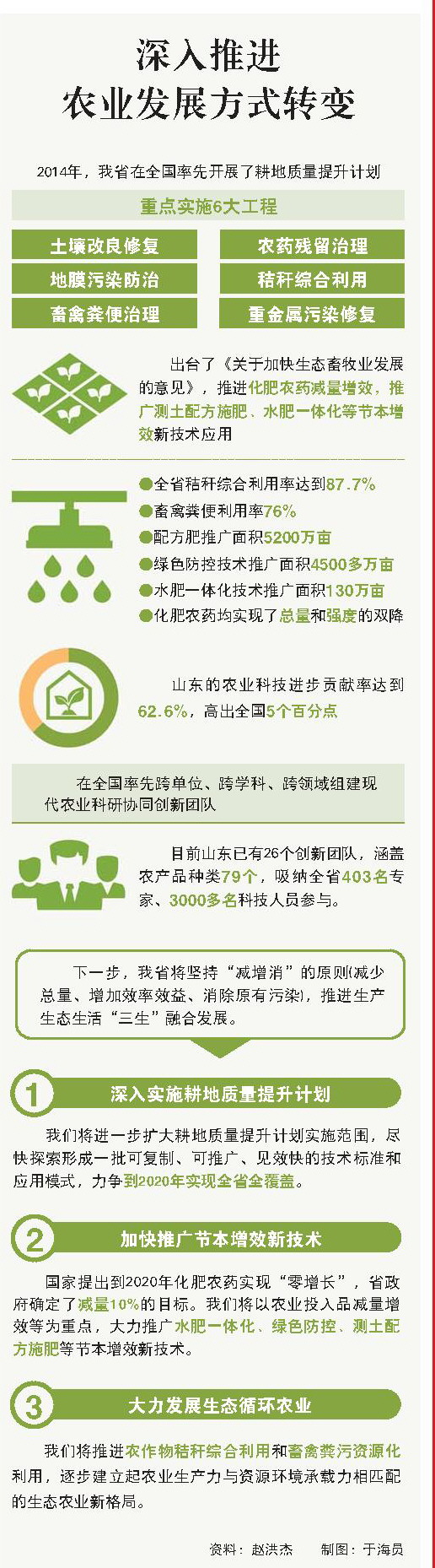 山東以綠色發(fā)展理念為指引,堅持“減增消”的原則(減少總量、增加效率效益、消除原有污染),推進生產(chǎn)生態(tài)生活“三生”融合發(fā)展,植物動物微生物“三物”循環(huán)共生,加快構(gòu)建生態(tài)修復(fù)長效機制。同時創(chuàng)新體制機制整合農(nóng)業(yè)科研人員的力量,讓科研成果寫在大地上。