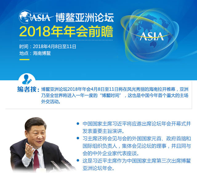博鰲亞洲論壇2018年年會4月8日至11日將在風光秀麗的海南拉開帷幕,亞洲乃至全世界將進入一年一度的“博鰲時間”,這也是中國今年首個重大 的主場外交活動。 [詳細]