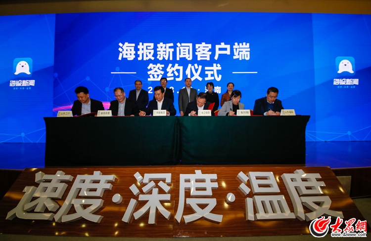 山東省互聯網傳媒集團與廳局代表、海報號入駐代表簽訂“海報新聞”政府頻道開通協議和入駐協議。