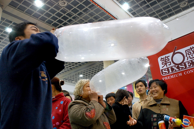 2004年3月14日,一位白發老人在吹安全套。濟南舜耕國際會展中心舉行3.15國際消費者權益日名優商品博覽會,某安全套經銷商,首次將其新研發的安全套產品打進博覽會,開展吹“安全套”有獎活動,來檢驗其產品的安全性和堅韌度。