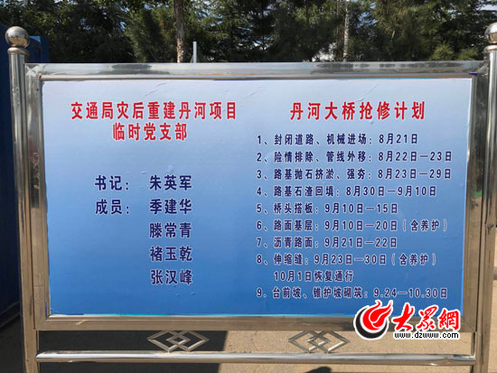 為保質(zhì)保量盡快完成搶修任務(wù),昌樂縣交通運(yùn)輸局黨委決定成立丹河大橋?yàn)?zāi)后重建臨時(shí)黨支部,充分發(fā)揮基層黨組織的戰(zhàn)斗堡壘作用和黨員的先鋒模范作用。施工單位倒排工期,掛圖作戰(zhàn),加班加點(diǎn),晝夜連續(xù)施工,力爭30天內(nèi)恢復(fù)通車,方便廣大群眾出行。