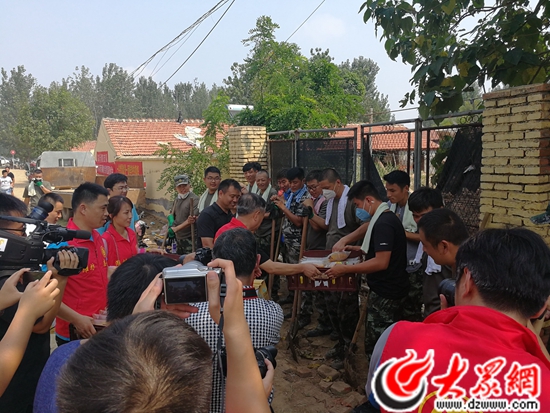29日上午,在王新航的帶領下,山東各地新階層的代表們一大早從濟南、濰坊、臨沂、菏澤、淄博等地,駕車先后來到上口鎮口子村和營里鎮黑冢子村,給搶險救災一線的消防官兵和當地村民們送去了牛奶、面包和煎餅等慰問品。