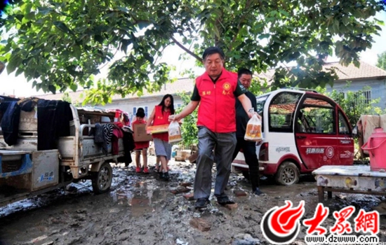 王新航的第一站是稻田鎮增盛村。“當時一進村看到,村里大部分房子都泡在水中。”王新航說,由于災情剛發生,當時村里的食物和飲用水都很緊缺。得知災區實際需求后,他立馬趕回濰坊市區,自掏腰包購置了一車面包和飲用水,緊急送往豐盛村。接下來的幾天,王新航每天都往增盛村等受災村鎮送面包、牛奶和飲用水等愛心物資。