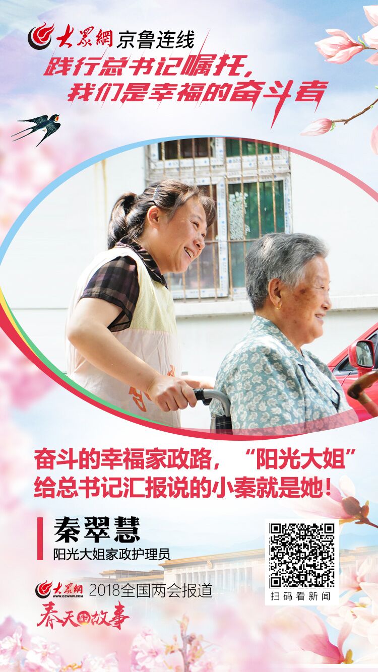 3月8日上午,“陽光大姐”卓長立向習總書記匯報了養老服務員小秦“一人就業全家脫貧”的故事。卓長立說的“小秦”,就是秦翠慧。8日晚,大眾網記者在濟南陽光大姐總部見到了“小秦”。