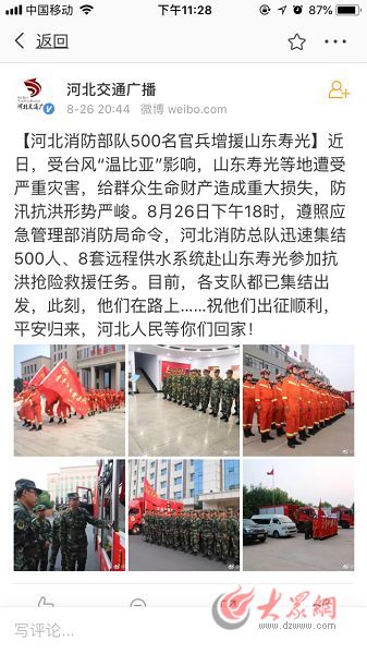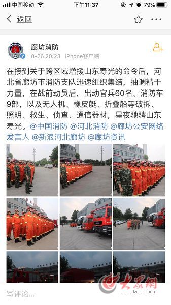 另外,大眾網記者從“南京消防”“揚州發布”“河北交通廣播”“邯鄲消防”等多個官方微博帳號搜索發現,目前江蘇和河北等臨近省份的大批消防官兵正向壽光集結,預計27日凌晨陸續到達。目前,截至8月26日晚22時許,來自濟南消防、聊城消防、青島消防、德州消防、濰坊消防、棗莊消防等的增援官兵陸續抵達壽光,在壽光市蔬菜科技博覽園集結,部分消防車輛完成集結后直奔前線,連夜展開救援。