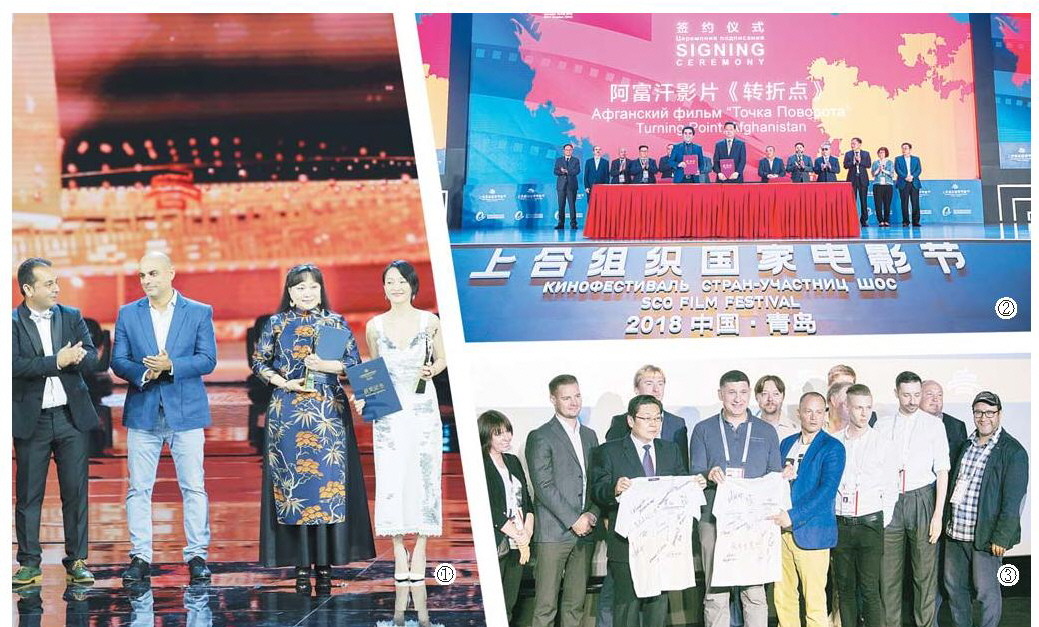 圖①:蒙古國演員歐東奇梅格·阿西多(右二)和中國演員周迅(右一)獲得首屆上合組織國家電影節“金海鷗獎”最佳女演員。圖②:中國電影集團公司與阿富汗影片《轉折點》簽訂意向書。圖③:俄羅斯電影人和簽名T恤一起合影留念,該T恤將保存在青島電影博物館。 □記者 薄克國 報道