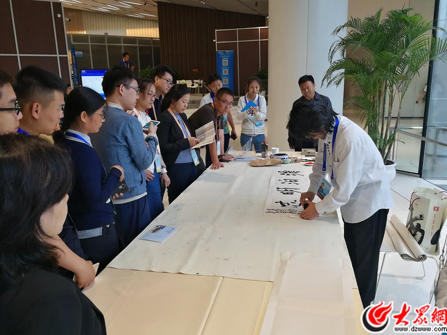 在新聞中心二樓,青島本地的兩位書法和國畫藝術家現場揮毫潑墨,展示中國藝術的獨特魅力,引起了大批中外記者觀看。在新聞發布廳的入口處,泰山十八盤、黃河入海口、濟南趵突泉、青島棧橋等20多幅照片組成的山東風光展,更是獻上了一場山東視覺大餐。