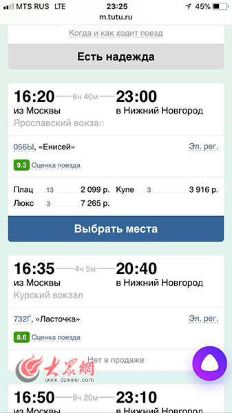 莫斯科當地時間6月20日深夜,購票網站顯示,莫斯科去往下諾夫哥羅德的車票已經售罄。