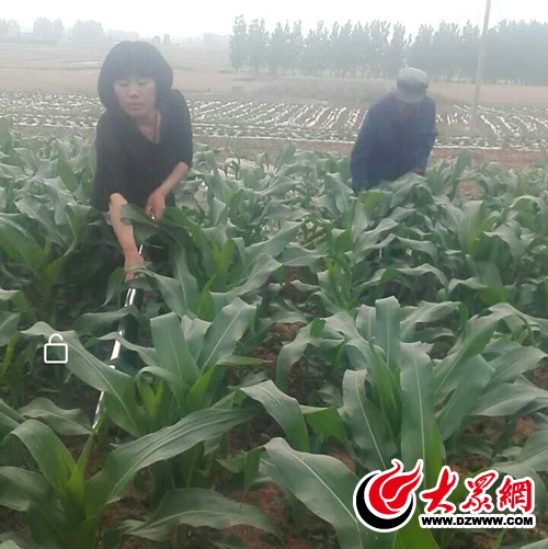 張云超的妻子李公珍正在玉米地里除草,后面的那個老人是他們花錢雇來的村里的貧困老人