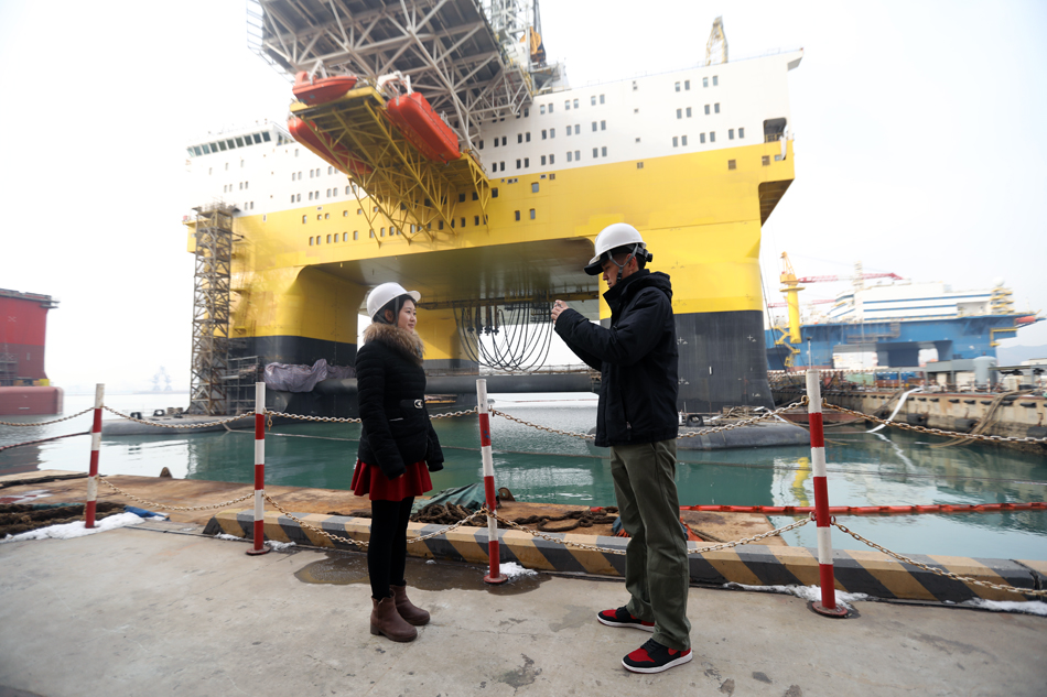采訪團記者在拍攝中集來福士的Beacon Atlantic鉆井平臺,拍攝姿勢非常“萌”。
