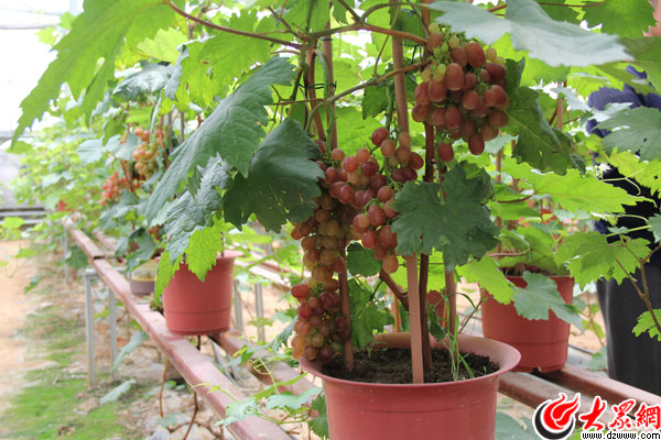 2016年,合作社建立了沙北頭農民創業園,率先引進盆景葡萄種植技術,建立了山東省第一家盆景葡萄規范化生產基地。“一米多高,藤蔓長在花盆里,既可觀賞又可食用。”5月25日,記者在沙北頭村的盆景葡萄大棚里見到了一盆盆晶瑩剔透的葡萄。