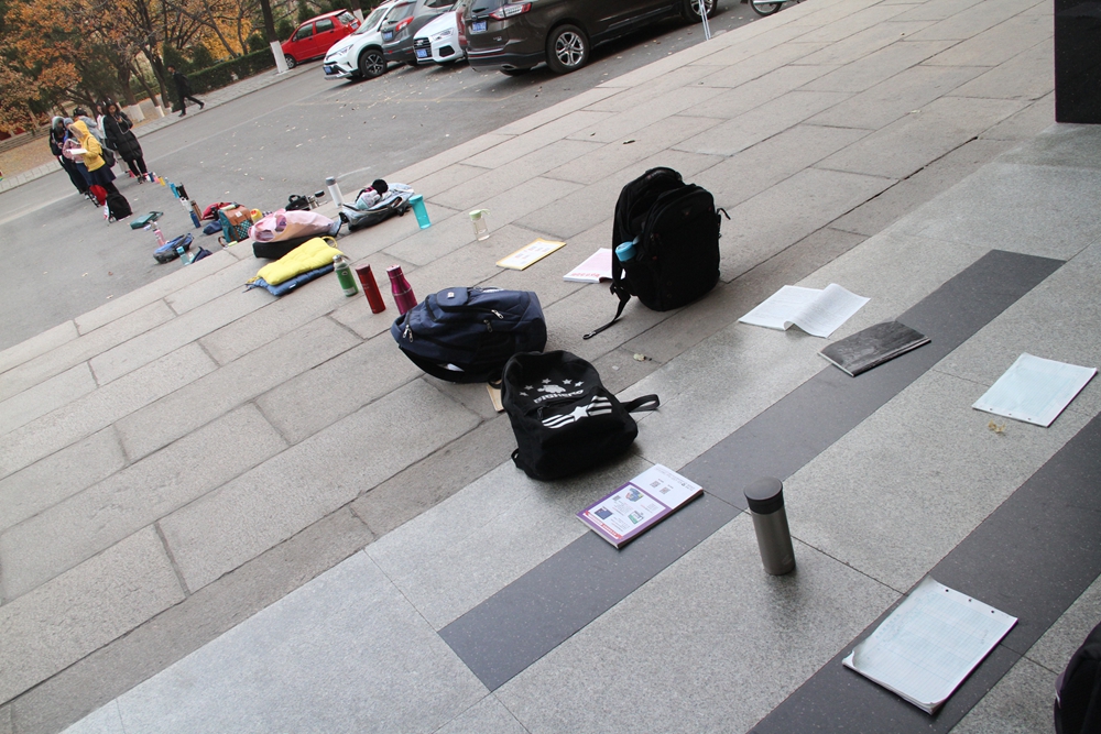 山東師范大學圖書館外,考研族用杯子、書包等物件拍成長隊。