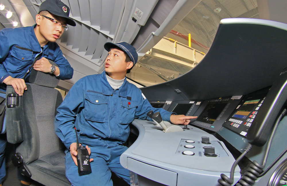 地勤機械師在對動車駕駛系統進行檢查。