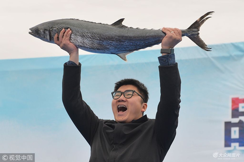 2018年4月13日,漁民在青島嶗山中心漁港沙子口鲅魚節(jié)上展示7.5公斤重“鲅魚王”。