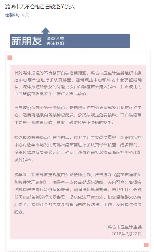 大眾網記者了解到,青島市疾控中心,臨沂市疾控中心,濰坊食品藥品監管局,德州德城區、陵城區、寧津縣疾控中心近日陸續發布公告稱,當地無涉事批次百白破疫苗流入。