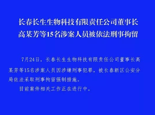 7月24日,長春長生生物科技有限責(zé)任公司董事長高某芳等15名涉案人員因涉嫌刑事犯罪,被長春新區(qū)公安分局依法采取刑事拘留強(qiáng)制措施。目前案件相關(guān)工作正在進(jìn)行中。長春新區(qū)公安分局 [詳細(xì)]