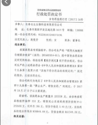 7月20日,長生生物發布公告稱,其全資子公司長春長生生物科技有限責任公司收到《吉林省食品藥品監督管理局行政處罰決定書》,原因是該公司生產的“吸附無細胞百白破聯合疫苗”,經食品藥品檢定研究院檢驗,檢驗結果“效價測定”項不符合規定。