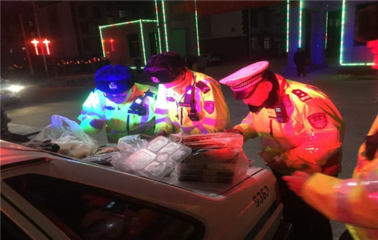 負責春晚分會場現(xiàn)場交通執(zhí)勤的泰安交警們的“年夜飯”