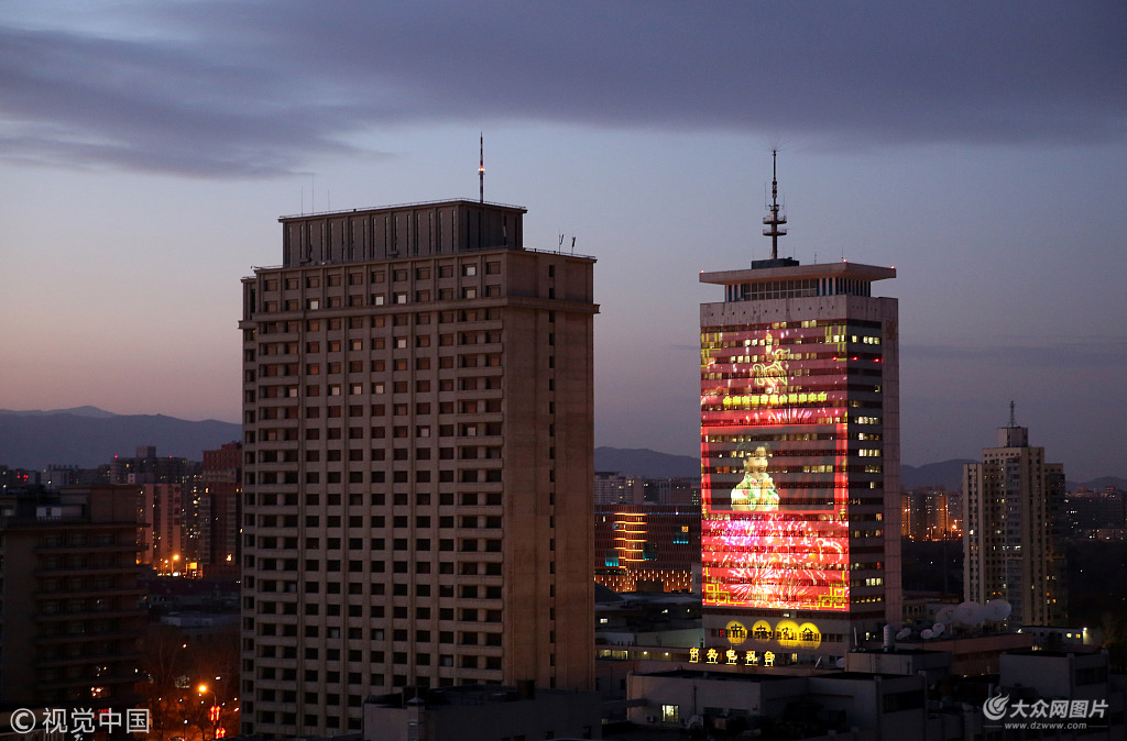 2018央視狗年春晚進入倒計時,中央電視臺大樓動態投影進行調試。