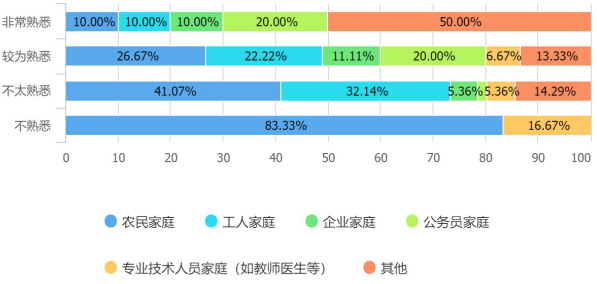 從家庭背景來看,在關于“您對大學生權利與義務了解多少”這一問題中,知道較多的前三類同學分別來自工人家庭34.04%,農民家庭25.53%,其他家庭17.02%。而完全不知道的同學來自農民家庭和工人家庭各一半(各占50.00%)。在關于“您對人大代表選舉流程熟悉程度如何”這一問題上,非常熟悉的同學主要來自其他家庭和公務員家庭,較為熟悉的前三類同學分別來自農民家庭,工人家庭和其他家庭,而完全不熟悉的同學主要來自農民家庭83.33%。結合其他問卷問題結果可以看出,一方面當下成長在農民和工人家庭的學生同樣具有一定的政治參與知識,并沒有因為所受家庭影響有所限制,相反,知識水平相對較高的公務員和專業技術人員家庭中成長的學生并沒有得到絕對的政治了解優勢。另一方面,農民和工人家庭環境中成長的學生仍然存在極端的政治知識的欠缺仍然需要加強基礎性的政治參與知識的普及。因此假設2具有一定的片面性。