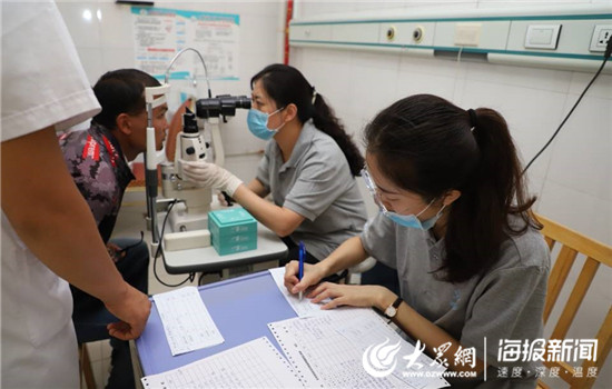山東大學(xué)第二醫(yī)院眼科青年醫(yī)生張曉陽(yáng)與志愿者棗莊市市中區(qū)人民醫(yī)院眼科主任湯靜搭檔進(jìn)行裂隙燈檢查,一天共登記填寫(xiě)了200多份患者信息卡。(仇晶 攝)