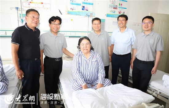 在英吉沙縣人民醫(yī)院病房,山東援疆干部、專家與患者合影留念(仇晶 攝)