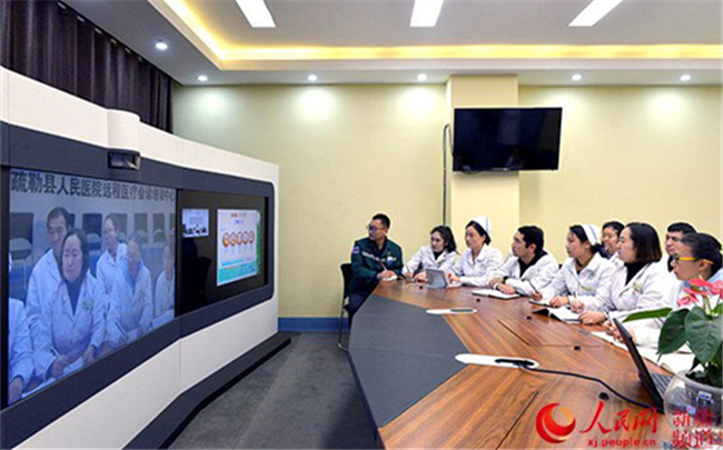 醫(yī)護(hù)人員在疏勒縣人民醫(yī)院與山東省援疆專家進(jìn)行遠(yuǎn)程會(huì)診。許珠珠攝