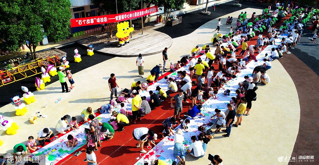 9月12日,浙江省臺(tái)州市仙居縣官路鎮(zhèn)中心幼兒園舉行“百個(gè)故事頌祖國”為主題的親子百米長(zhǎng)卷繪祖國活動(dòng)(無人機(jī)拍攝)。