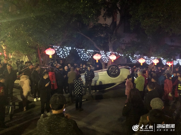 因有礙消防車輛通行,一輛私家車被群眾掀翻在路邊。