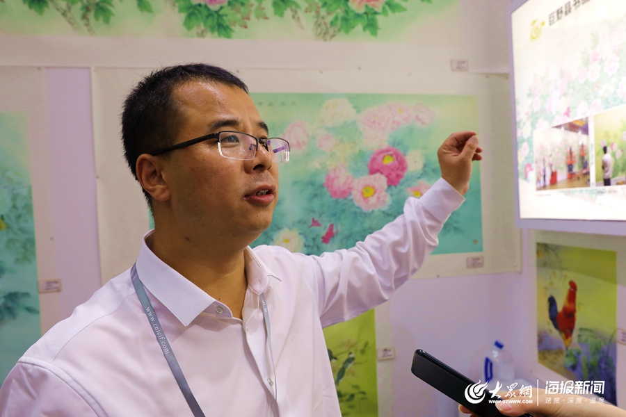 巨野書畫院院長程軍偉向記者介紹產業發展情況。