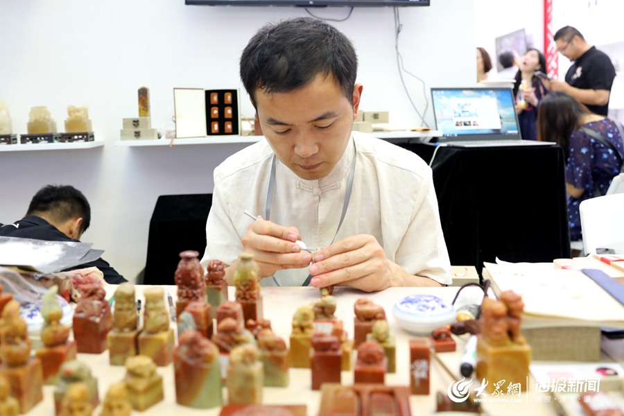 金石篆刻非遺傳承人、孔府印閣執印孔令千在文博會現場進行創作。