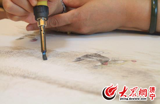 談到繪畫,大家自然會聯想到素描、水彩、油畫等等,卻很少有人對烙畫有深入認識。在采訪烙畫傳承人萬東梅時,記者才了解到,烙畫古稱“火針刺繡”,是一門傳承千年的藝術!捌湟曰馂椤詫嵝阅芎玫慕饘贋楫嫻P,以木板為媒介,通過加熱金屬畫筆使木板發生不同程度和方式的炭化!比f東梅告訴記者,通過烙筆的使用才可以呈現出自然的淡黃、中黃、棕、褐、黑等多種色彩和不同的質感、立體感、光感等,從而組織出內容豐富的畫面。