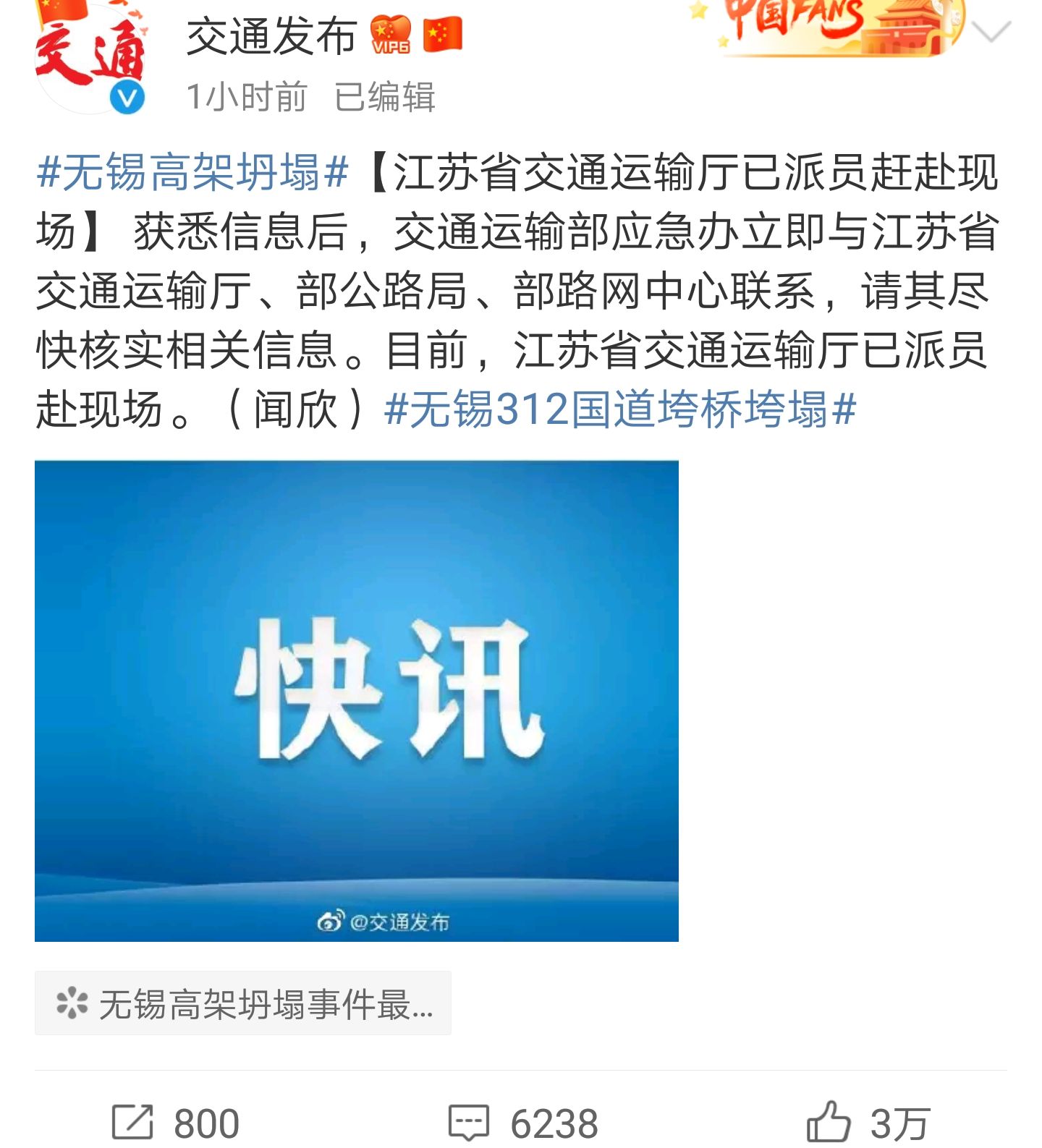 另據交通發布官微消息,獲悉信息后,交通運輸部應急辦立即與江蘇省交通運輸廳、部公路局、部路網中心聯系,請其盡快核實相關信息。目前,江蘇省交通運輸廳已派員赴現場。