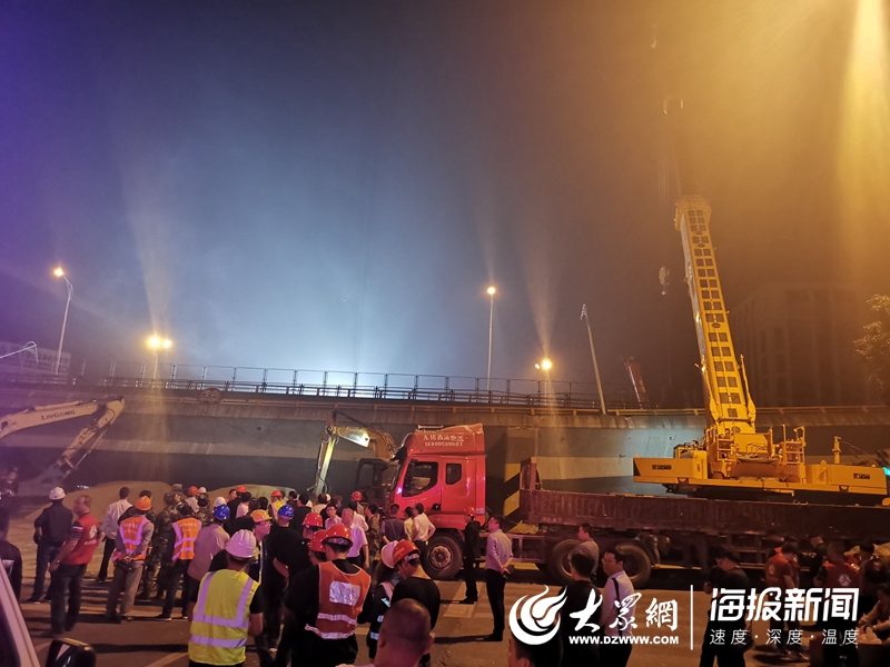 10日晚23時,記者在現場看到,側翻的橋面有數十米長,一輛拉著鋼材的大貨車仍停留在側翻的橋面上。現場救援人員正在緊急破拆側翻的橋面。
