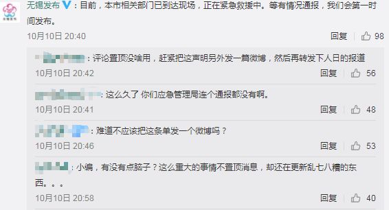 直到10日20時40分,“無錫發布”才在微博評論中置頂了一句評論:“目前,本市相關部門已到達現場,正在緊急救援中。等有情況通報,我們會第一時間發布。”但該條評論不但沒有解決網友的疑惑,反而引發了更加強烈的質疑。有網友評論說:“難道不應該把這條單發一個微博嗎?”“置頂在評論里?你哪怕不清楚現場情況至少趕緊聯系交警把怎么封路的,該繞行的路段什么的外圍信息貼出來吧”“發生重大事故,官媒第一時間要敢于站出來做權威發布,反應越慢,謠言就傳的越快。這個時間點還發些無關的,還不如憋著不吭呢。”