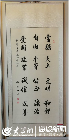 參展作者飽蘸著幸福與喜悅,用手中的筆濃墨重彩地謳歌改革開放的偉大成就,暢想偉大祖國的宏偉藍圖,齊聲奏響新時代的藝術篇章。退休老教師孫松山書寫了24字的社會主義核心價值觀,得到眾人一致點贊。招遠一中的高三學生丁旭亮也帶來兩幅作品參展。小丁從6歲開始學書法,現已小有所成。“課業閑暇時,寫寫字,可以舒緩緊張的學習生活,豐富自己的業余生活”,小丁告訴記者。