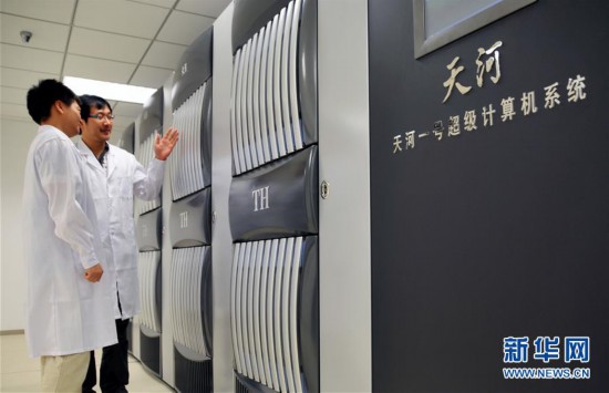 國家超算天津中心應用研發部部長孟祥飛(右一)帶同事巡檢“天河一號”運行狀況(資料照片)。 新華社記者 毛振華 攝
