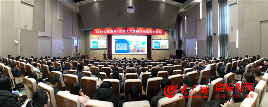 淄博市人力資源和社會保障局、淄博市就業服務中心首先在山東大學中心校區知新樓三樓報告廳舉辦宣傳推介會,向來自全國各地的優秀畢業生全方位推介淄博,宣傳“人才金政37條”,擴大淄博知名度,增強求職者來淄發展的信心和決心。430人的報告廳一座難求,不少學生只好站在走廊、過道。